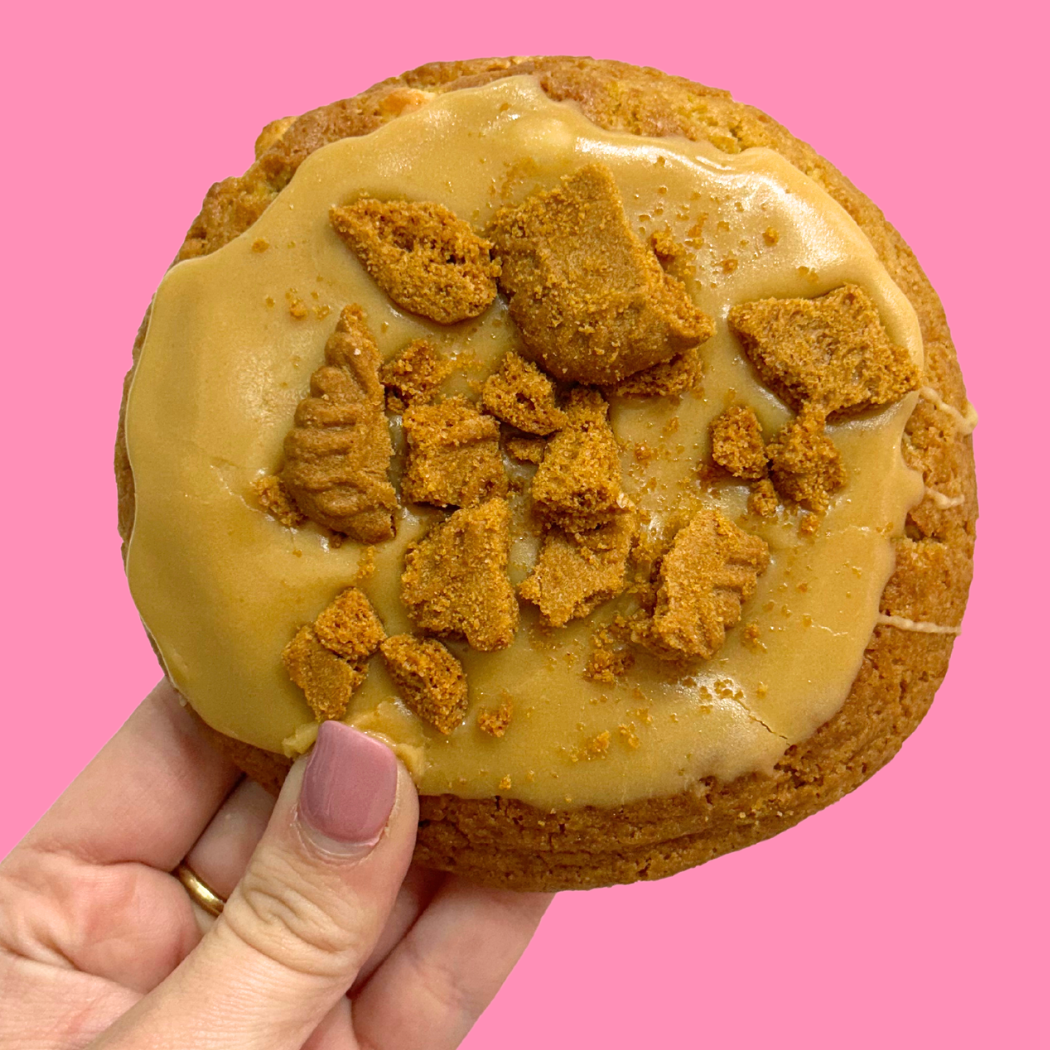 Signature cinnamon dough mixed with white chocolate chips, topped with cookie butter glaze and Biscoff cookie crumbs