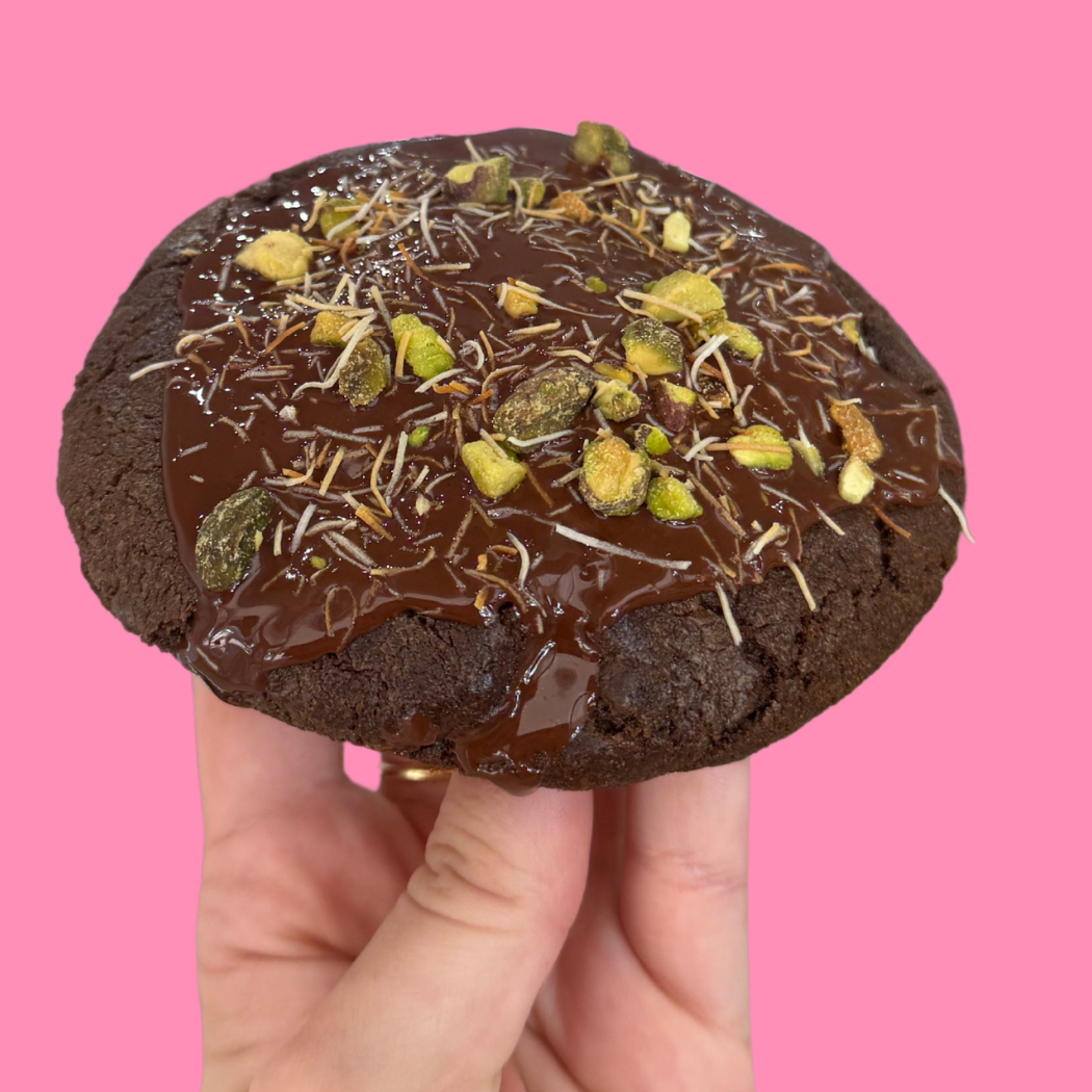 Signature chocolate dough mixed with milk chocolate, stuffed with a crunchy pistachio filling. Topped with a rich chocolate shell, then finished with crushed pistachios and roasted kadayif.