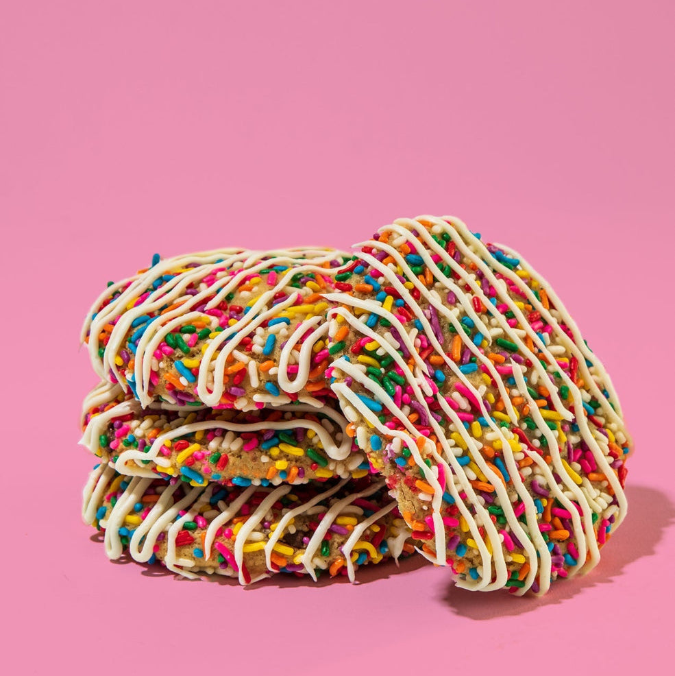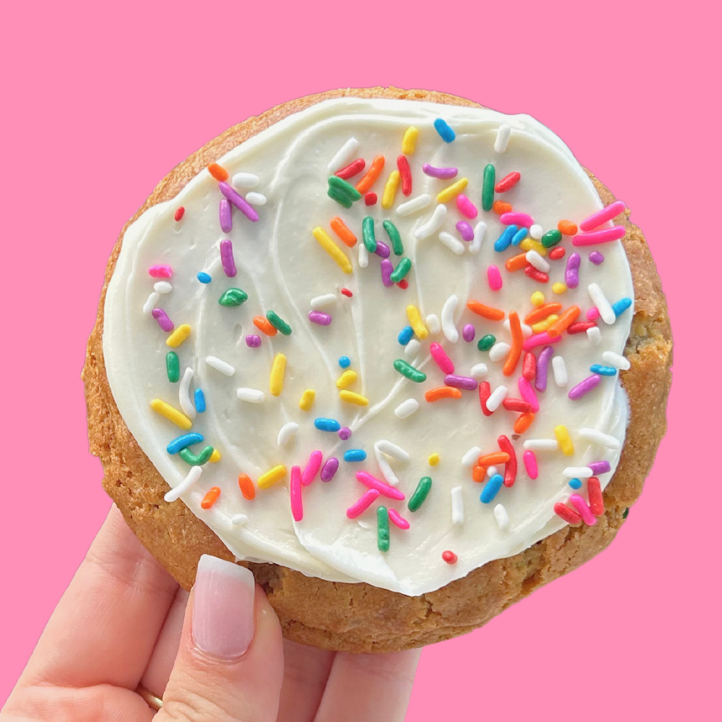 Our signature dough is the focal point of this favorite! Topped with vanilla frosting and rainbow sprinkles.