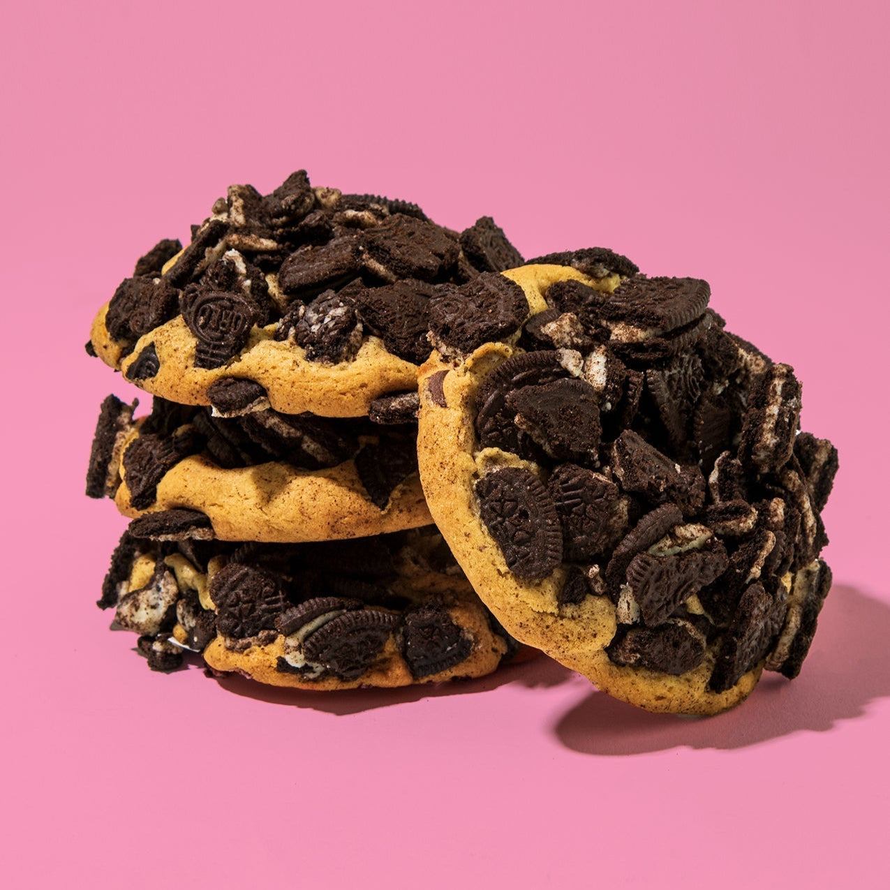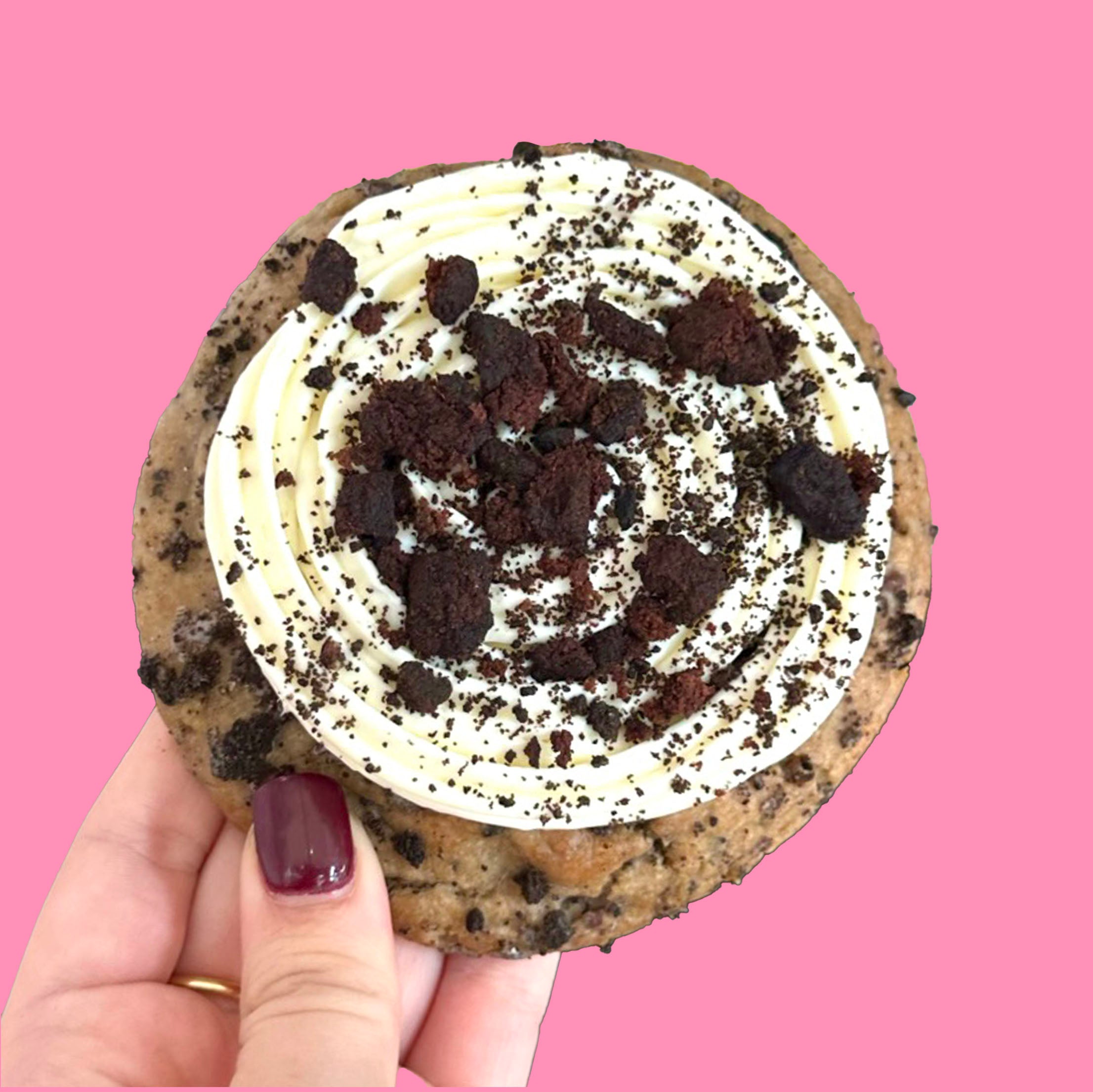 Signature dough mixed with milk chocolate chips and Oreo cookie bits. Topped with house made cream cheese frosting, brownie bits, and Oreo Powder.