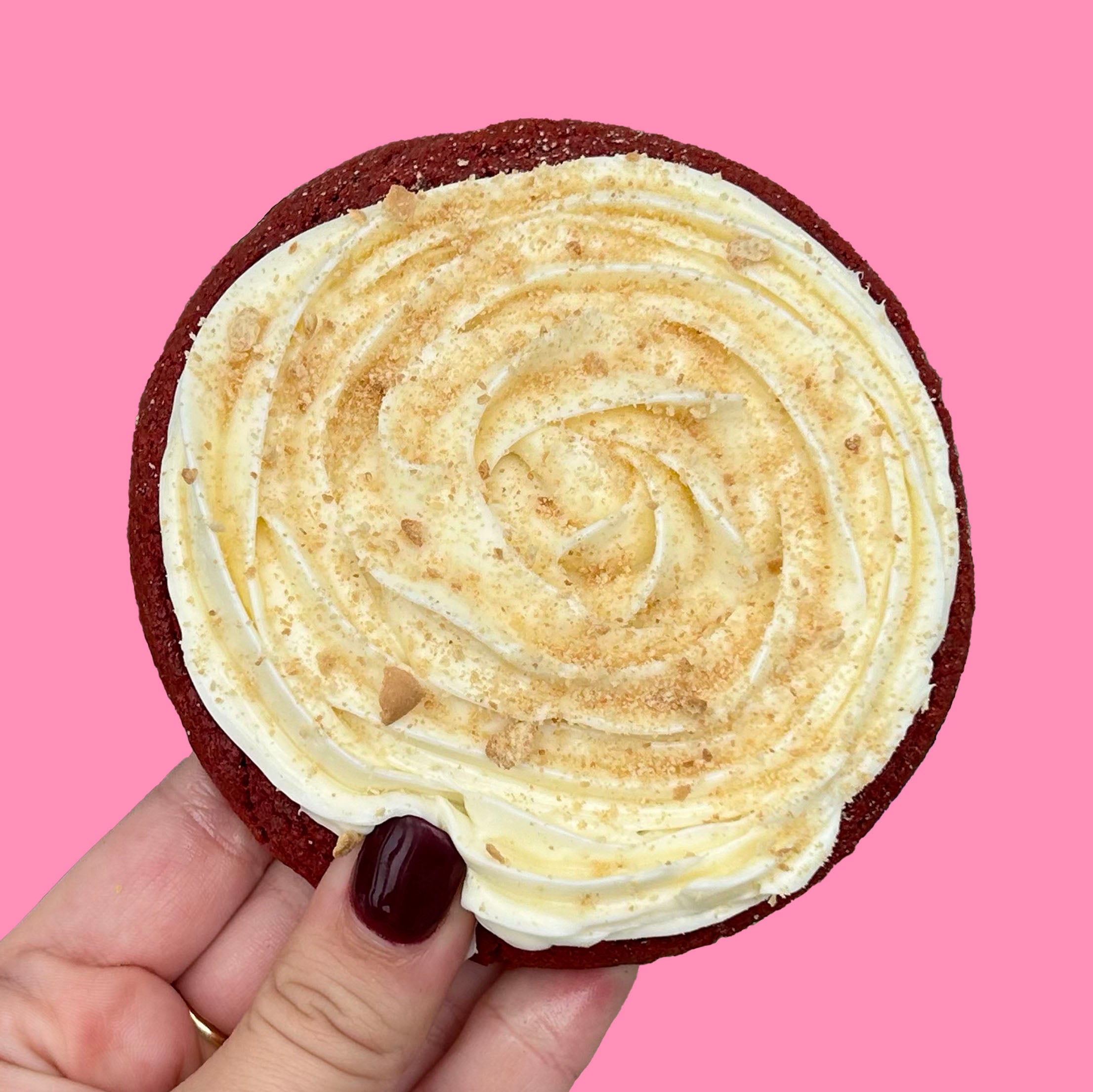 Signature red velvet dough stuffed with white chocolate chips, topped with house made cream cheese frosting and finished with graham cracker crumbs.