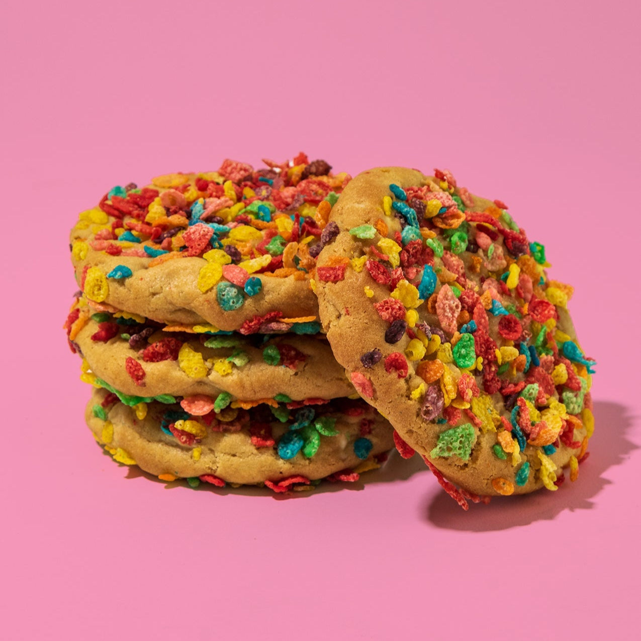 Signature dough stuffed with white chocolate chips and topped with crunchy Fruity Pebbles cereal.